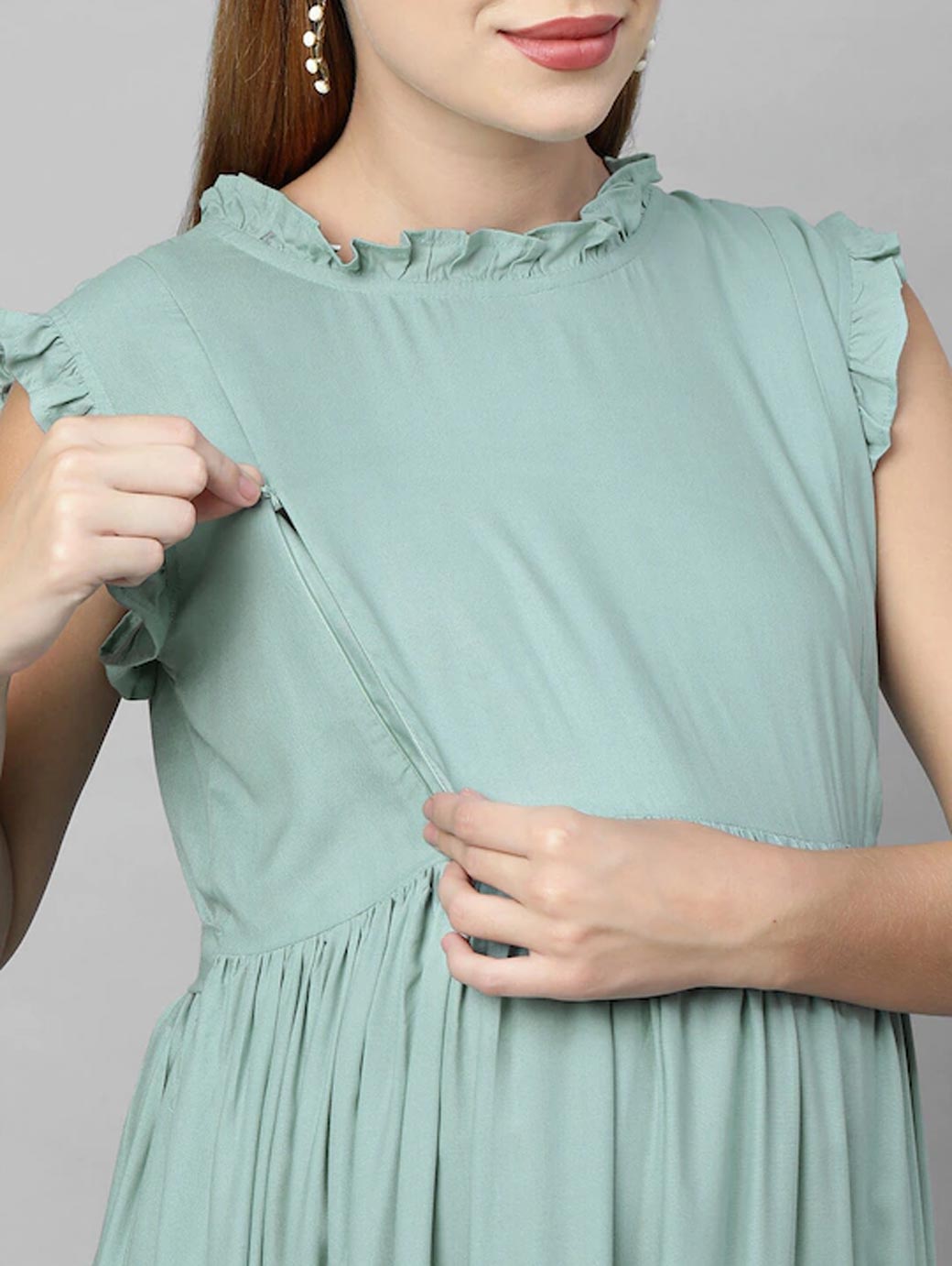 Green solid a-line dress High neck Sleeveless, no sleeves Ruffled detail Midi length in flared hem Comes with a belt