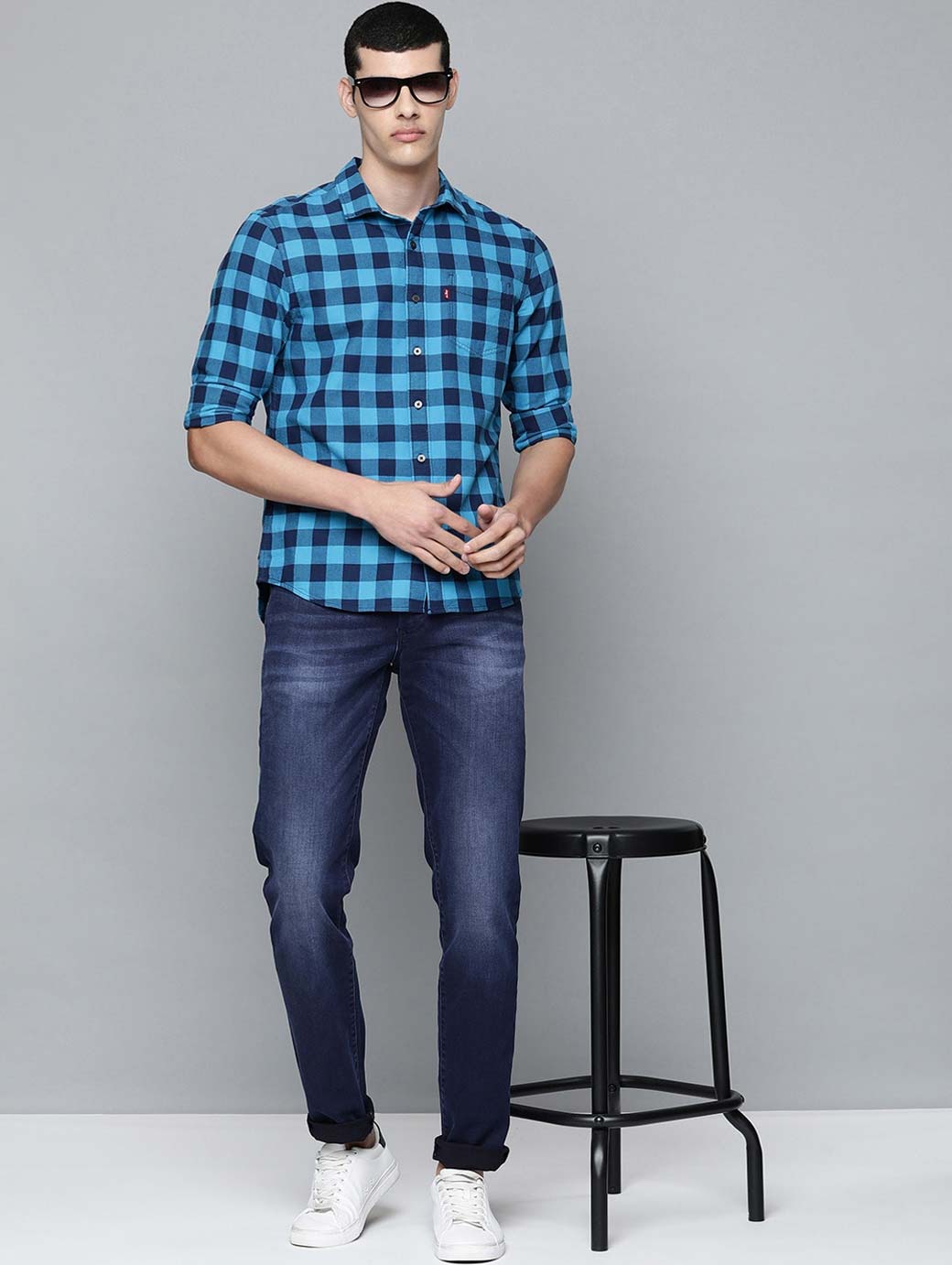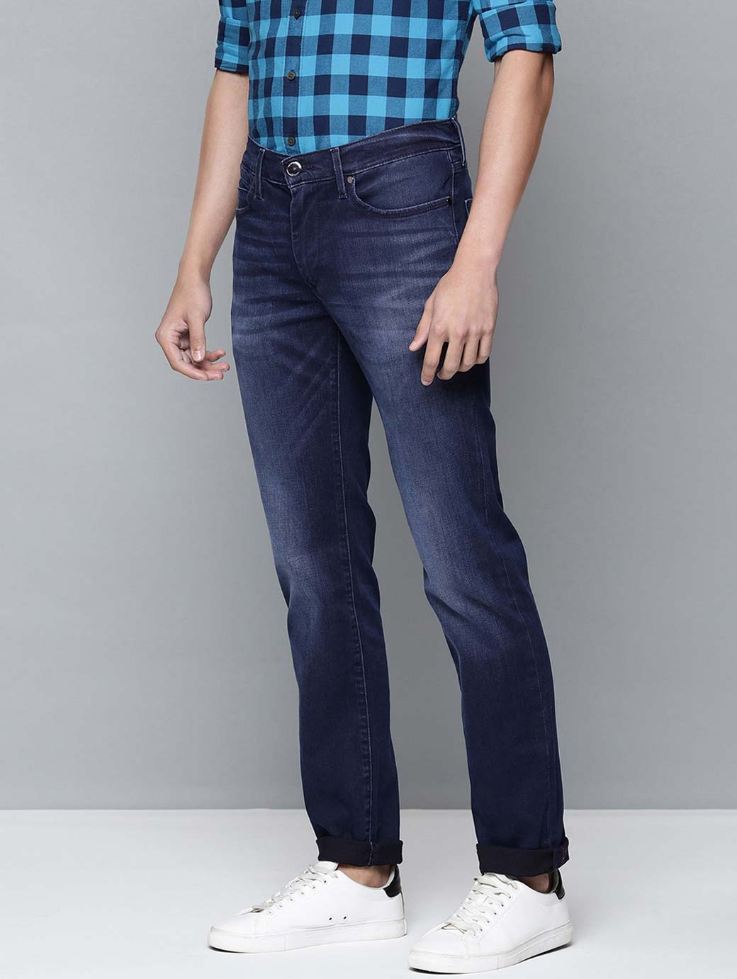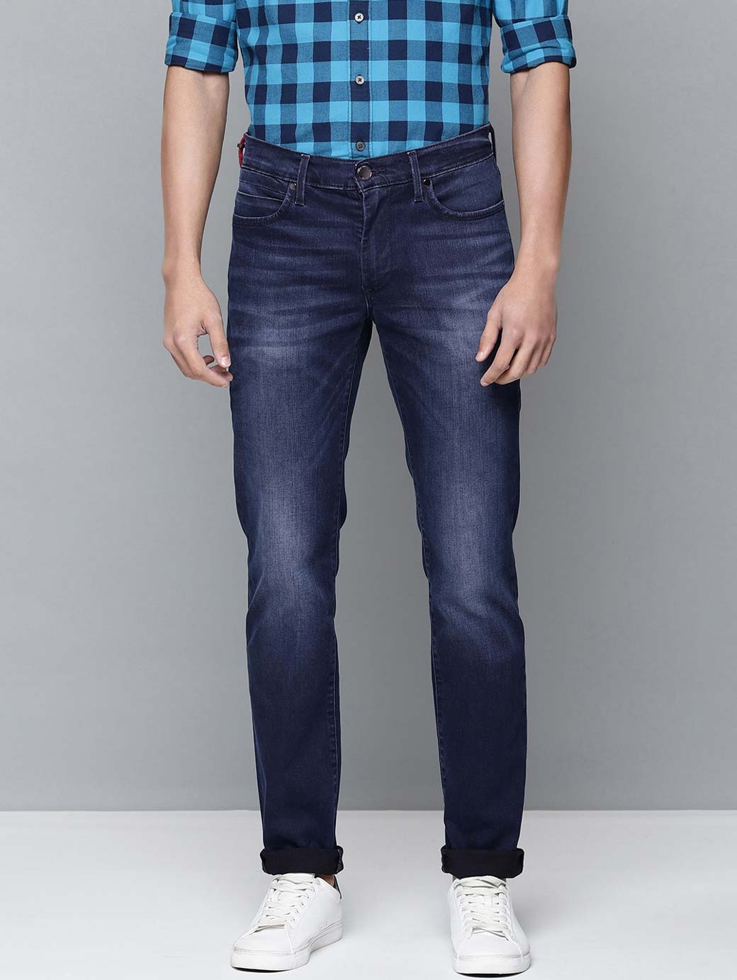 - Medium shade, light fade blue jeans