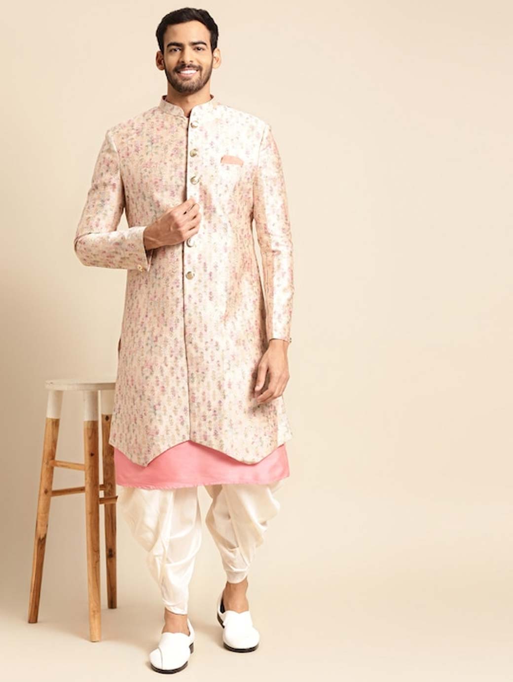 Cream-coloured woven design kurta, has mandarin collar and long sleeves Pink solid kurta, has a mandarin collar and long sleeves Off-white solid dhoti, has an elasticated waistband with drawstring closure