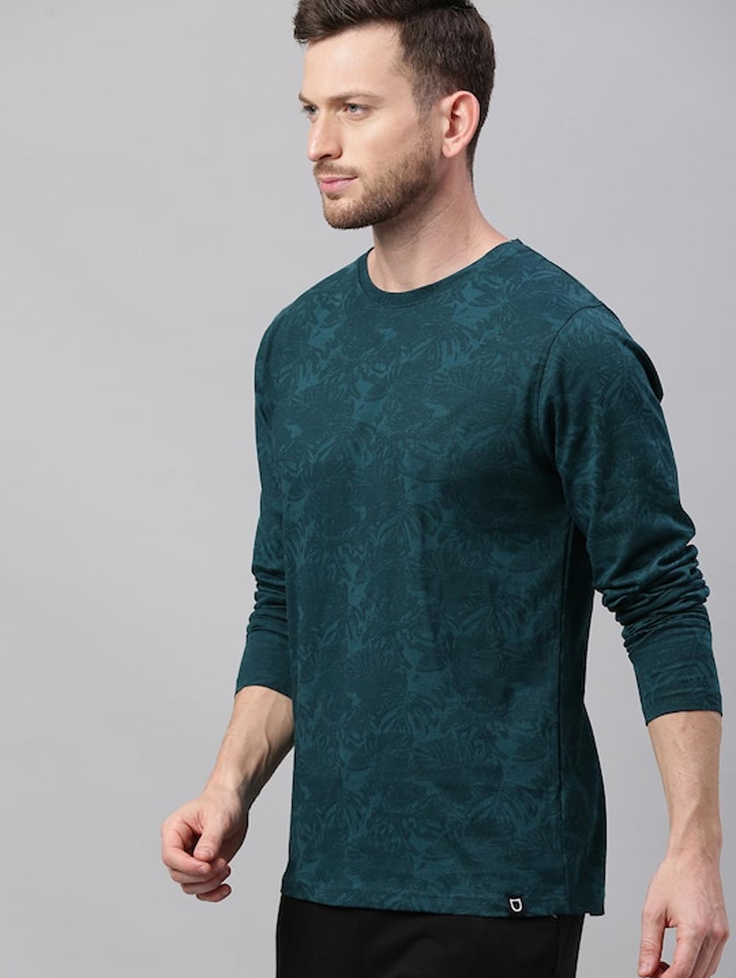 Teal green Tropical printed T-shirt, has a round neck, and long sleeves