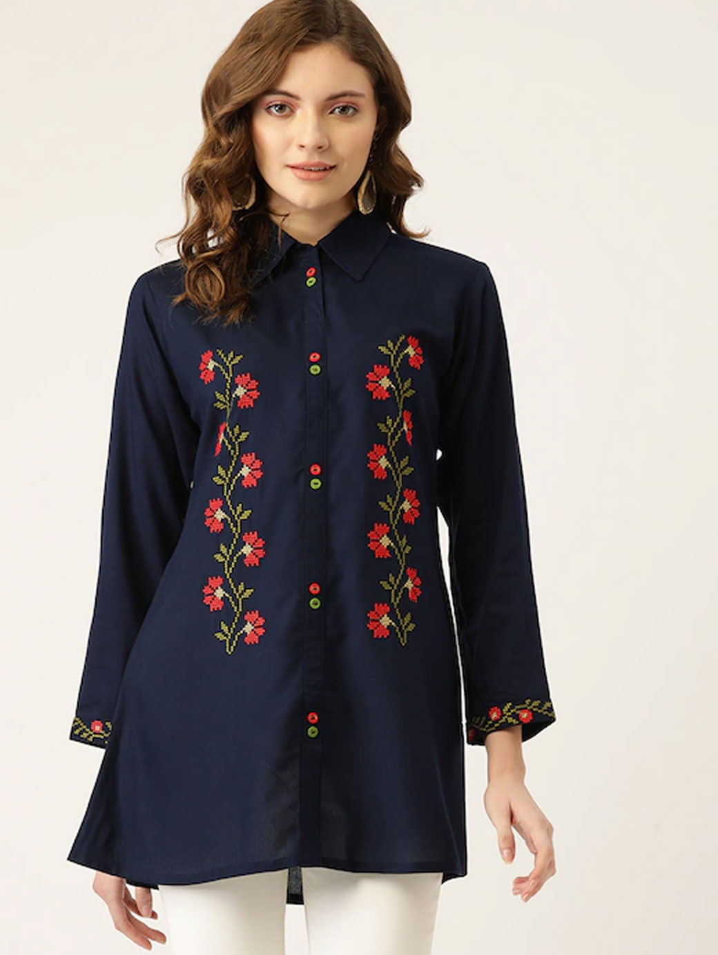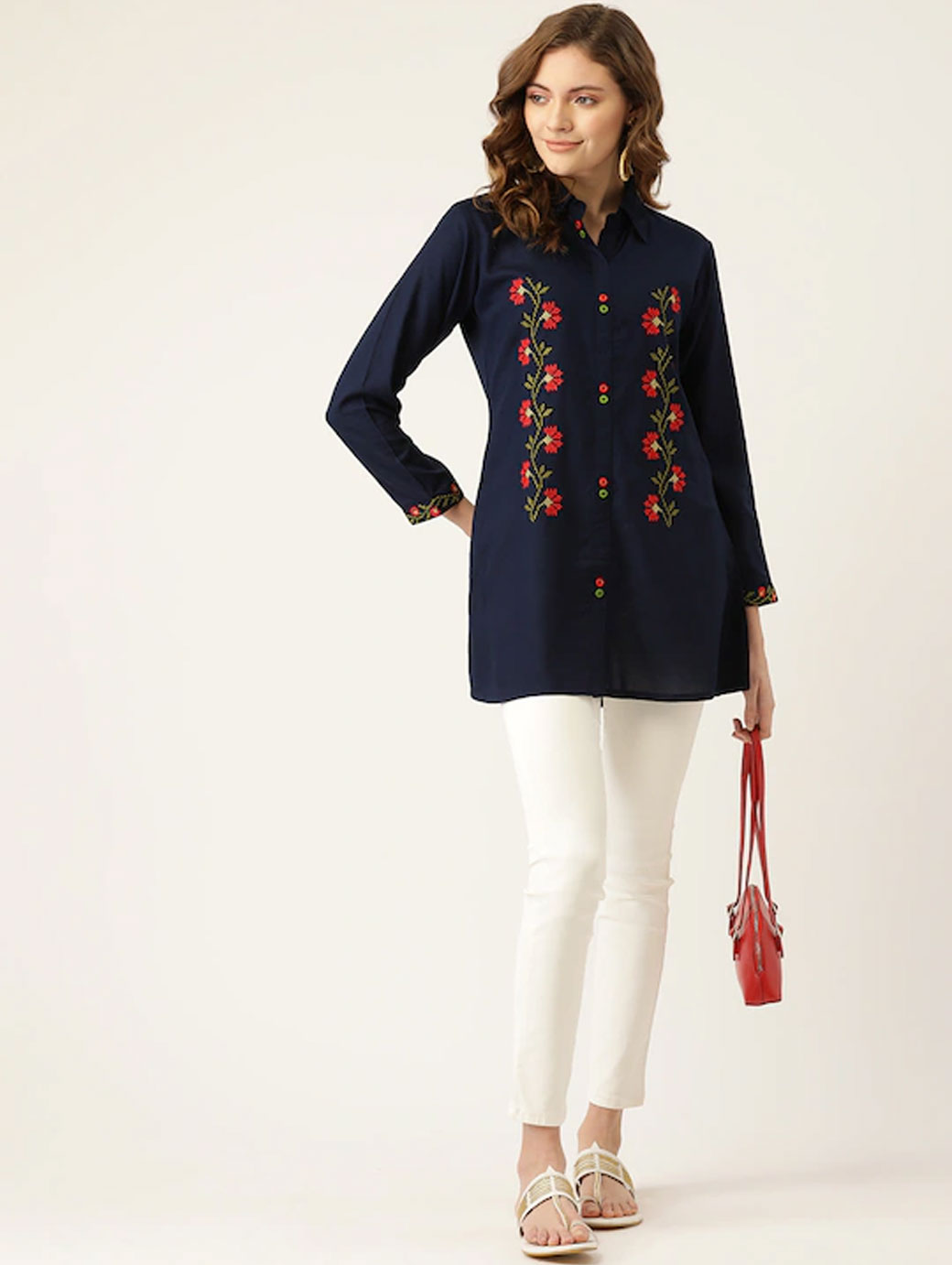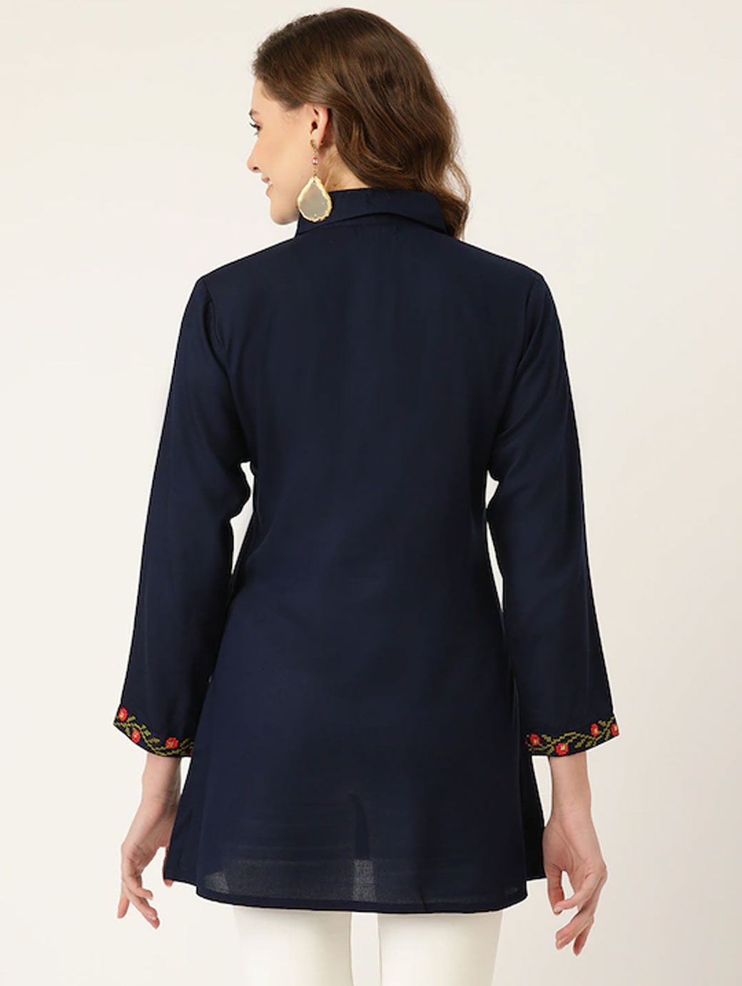 Navy blue embroidered tunic, has a shirt collar, three-quarter sleeves, embroidered.