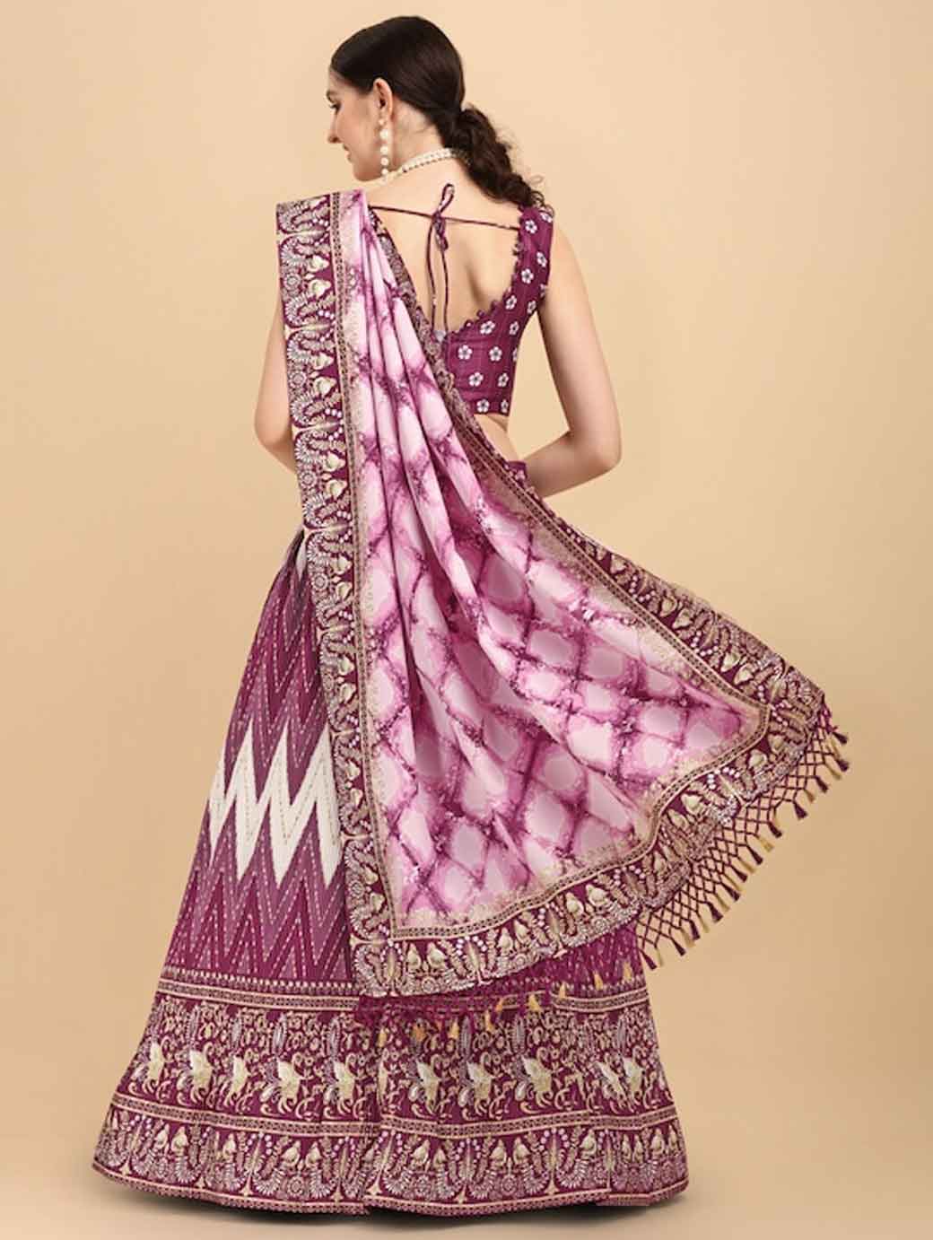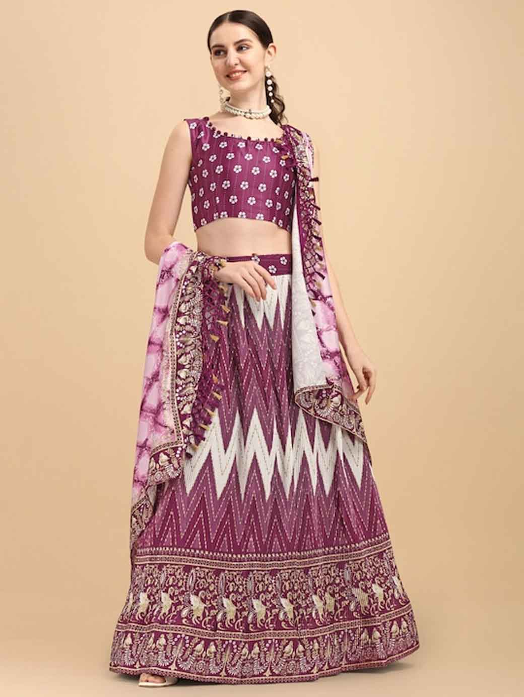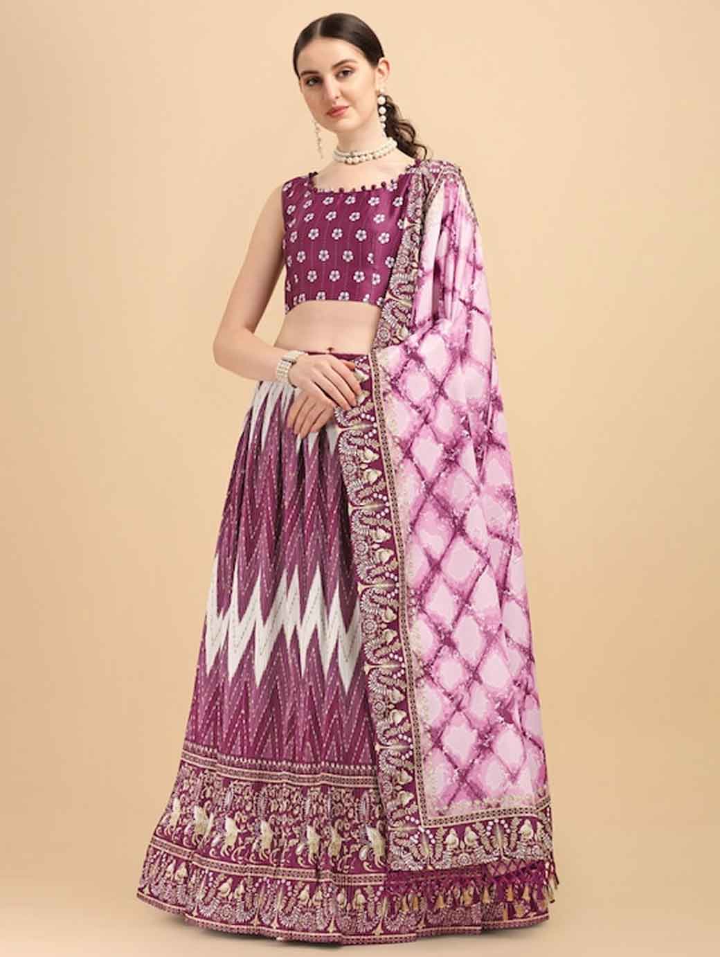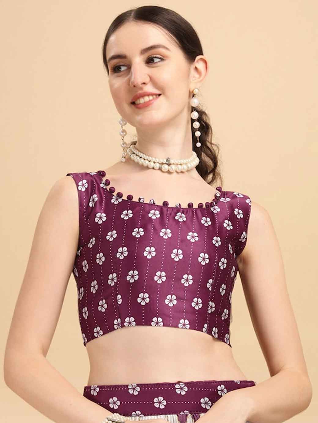 Purple & White Printed Semi-Stitched Lehenga & Unstitched Blouse With Dupatta