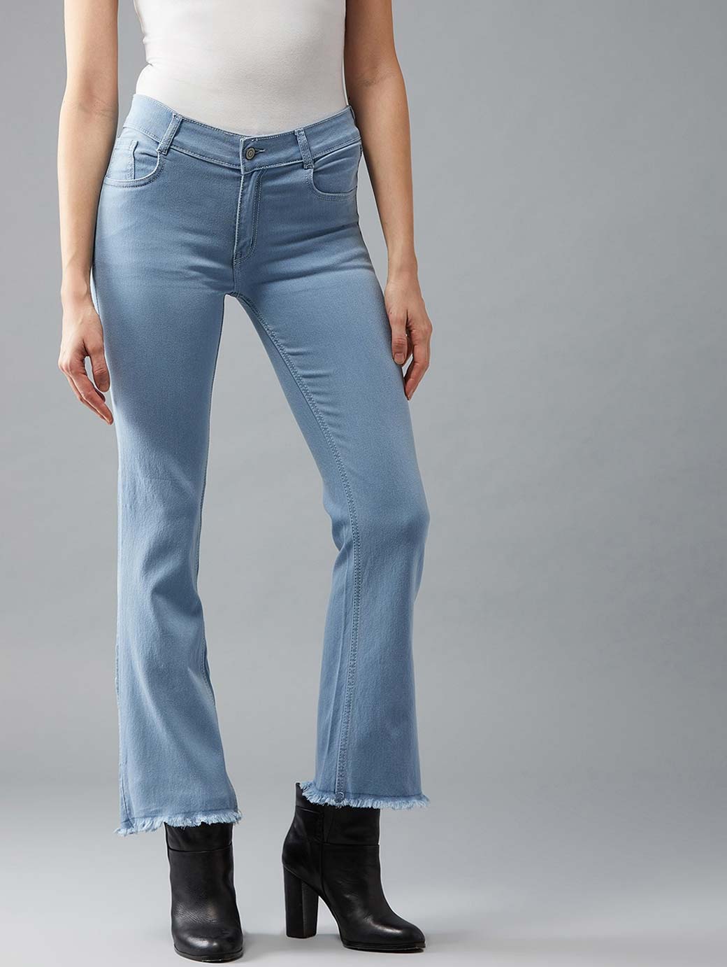 Blue medium wash 5-pocket high-rise jeans, clean look, light fade, has a button and zip closure, and waistband with belt loops