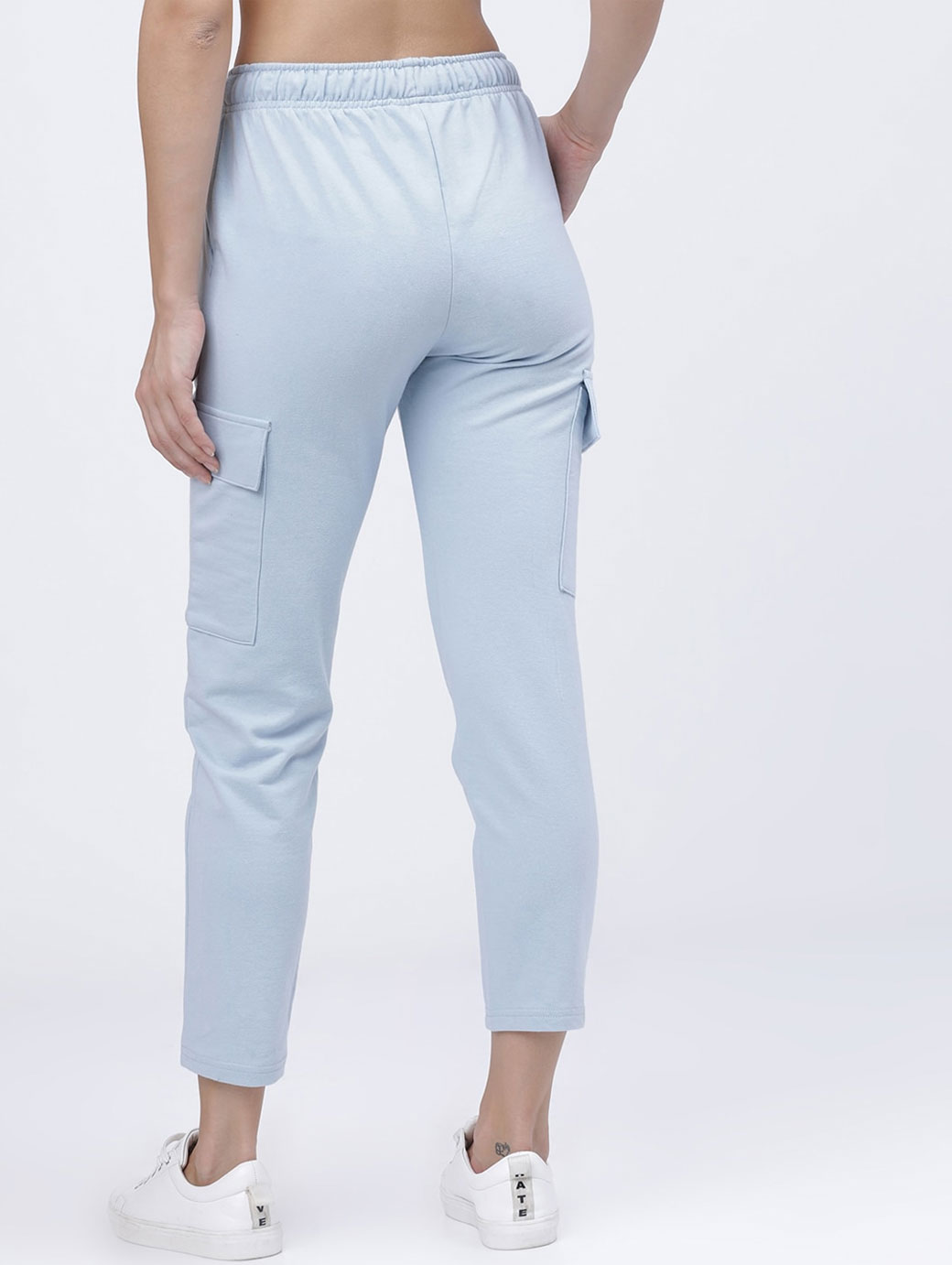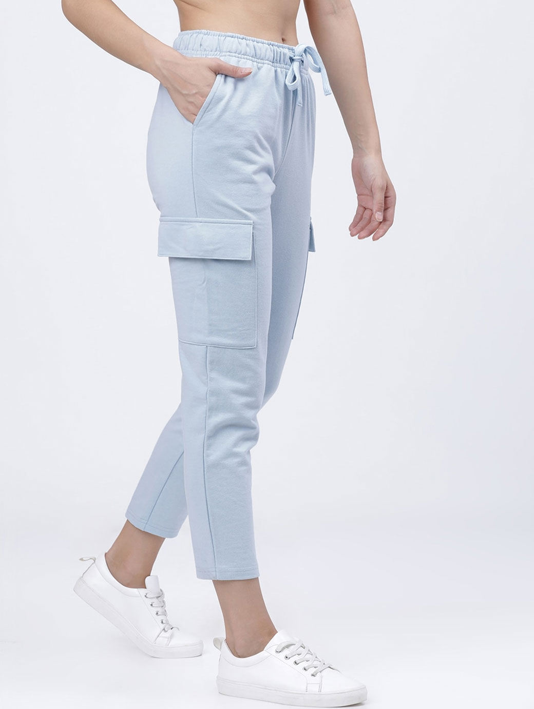Blue solid slim-fit casual cargo track pants, has an elasticated waistband with a drawstring fastening, two side pockets and two flap pockets