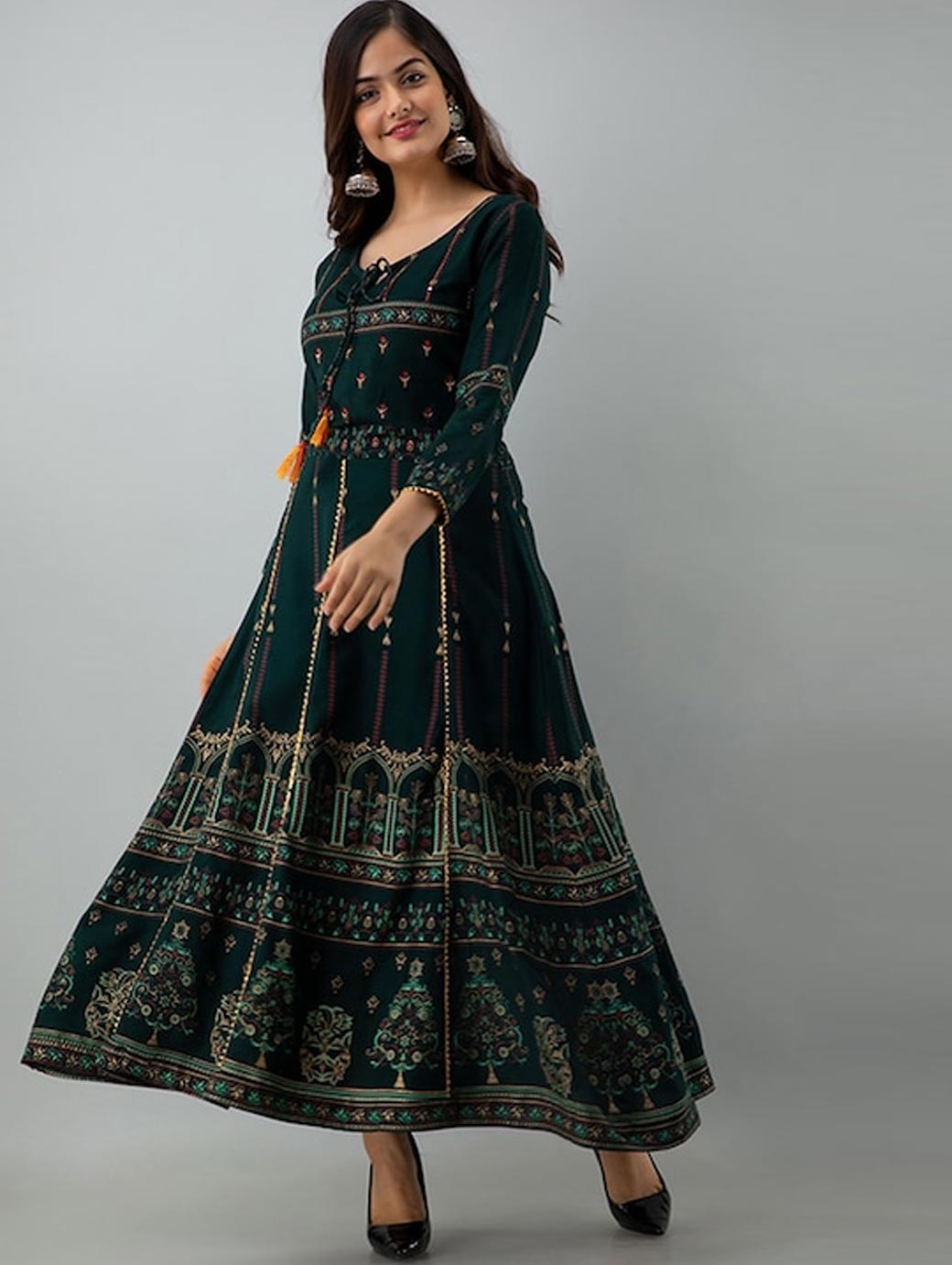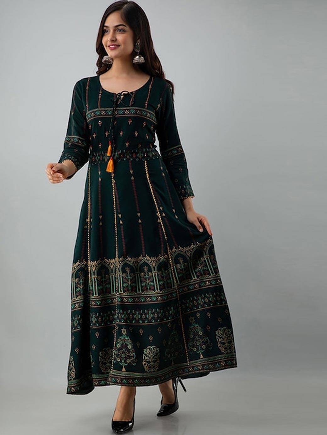Ethnic motifs printed Tie-up neck Long, regular sleeves Anarkali shape with regular style Thread work detail Ankle length with flared hem Machine weave regular viscose rayon