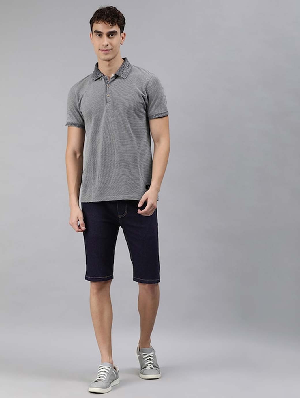 Grey striped mid-rise slim fit shorts has button closure and 4 pockets