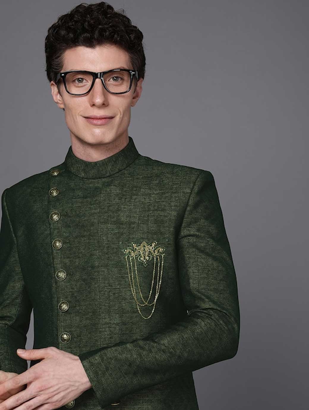 Complete The Look Manyavar proudly presents a wide range of fusion wear for men and this exceptional dark green attire is a must-have. The contemporary green indo-western is a unique style that instantly gets you all compliments.