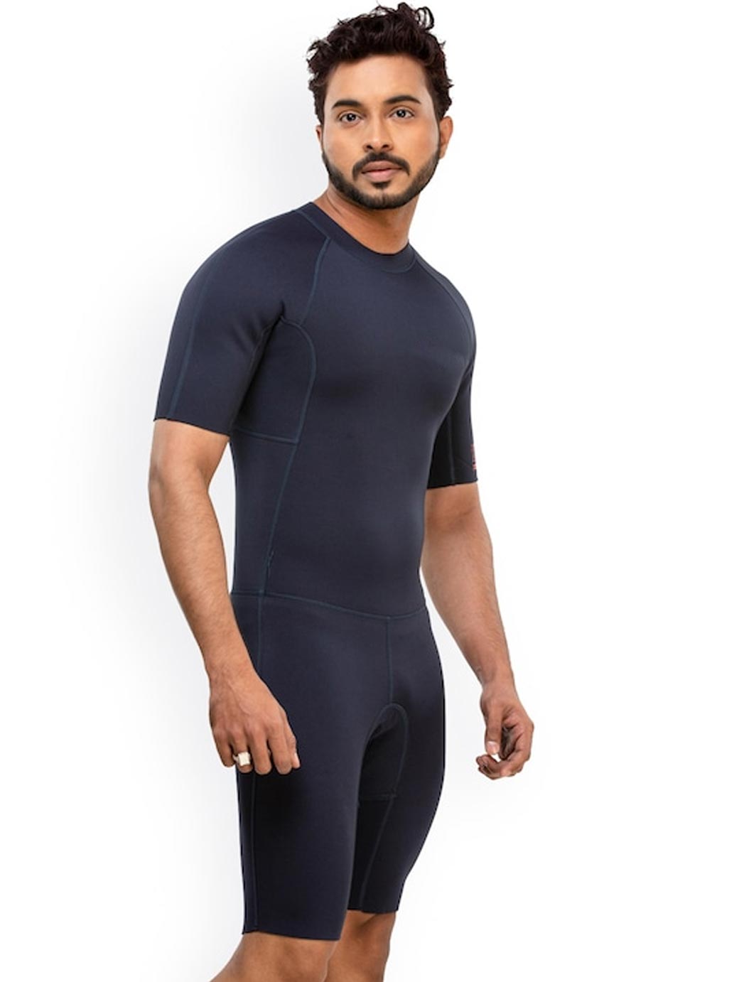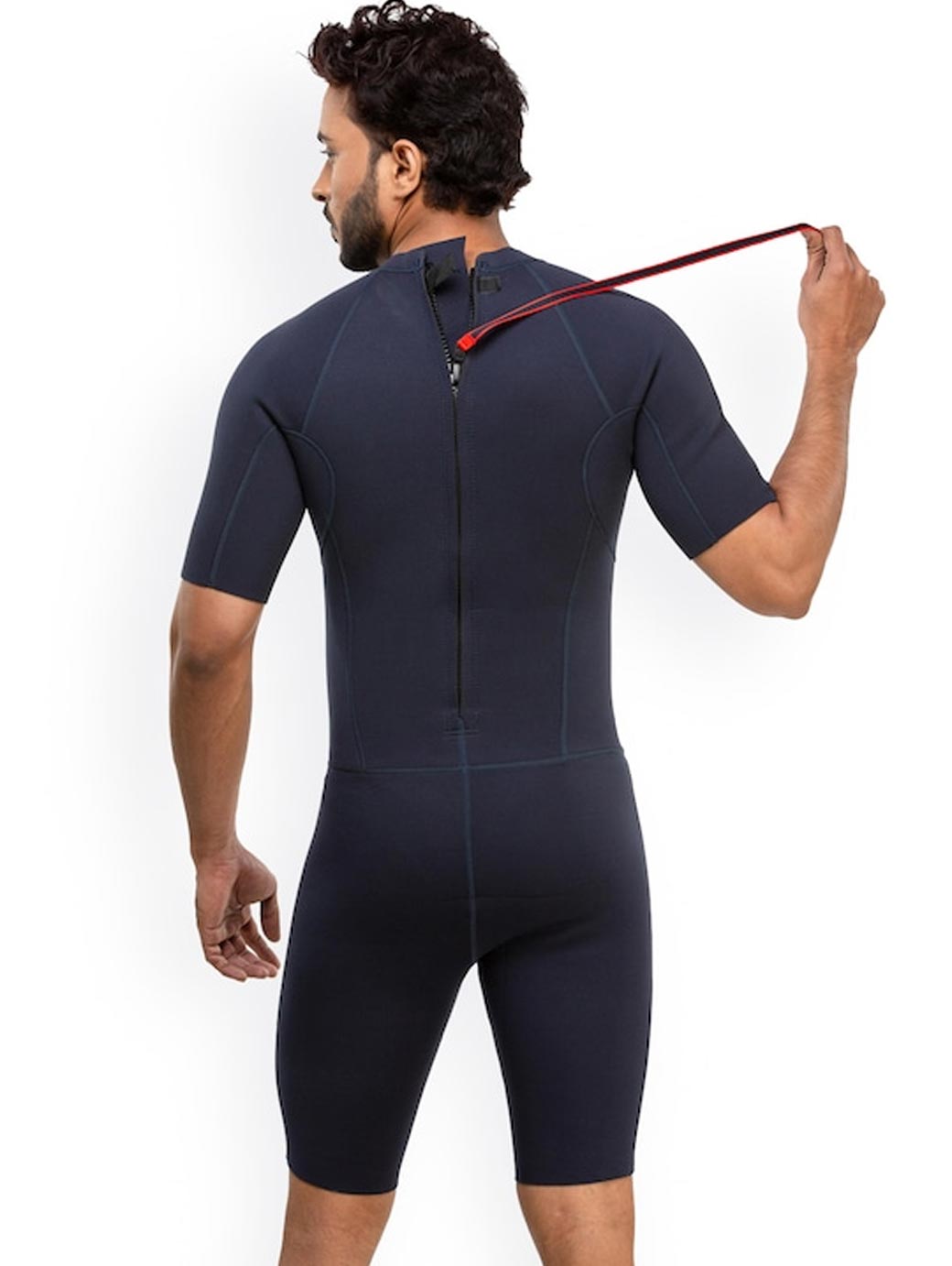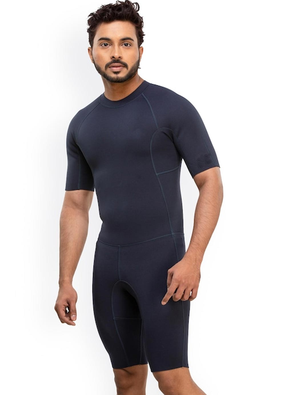 Navy blue solid shorty wetsuit, has a round neck, short sleeves, zip closure on the back