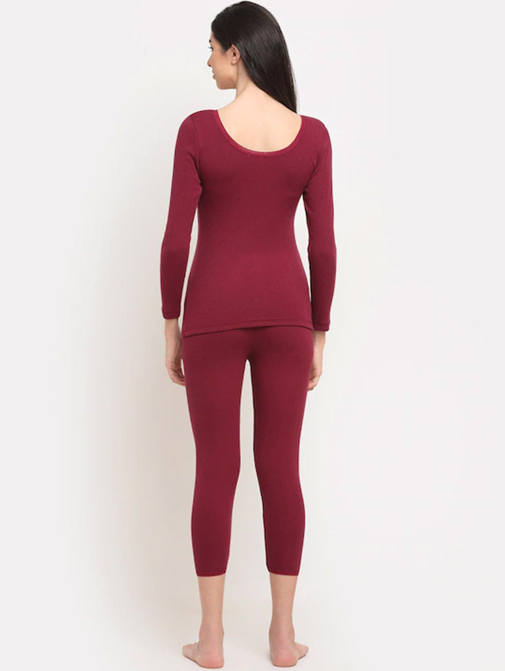 Maroon Self-Design thermal top, has a round-neck, full sleeves