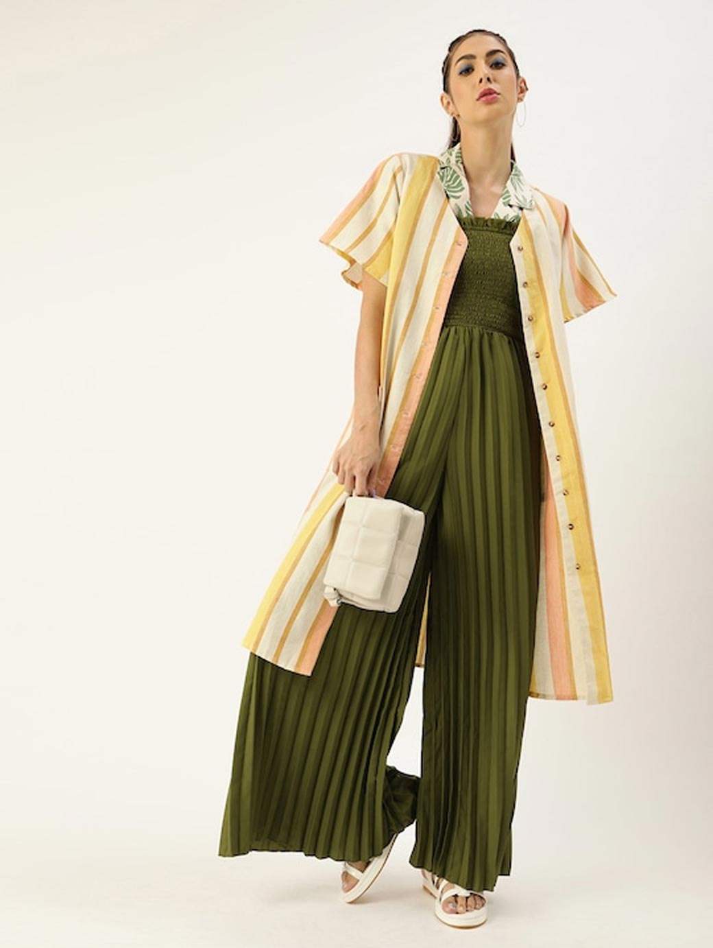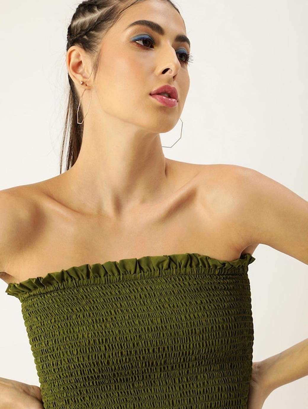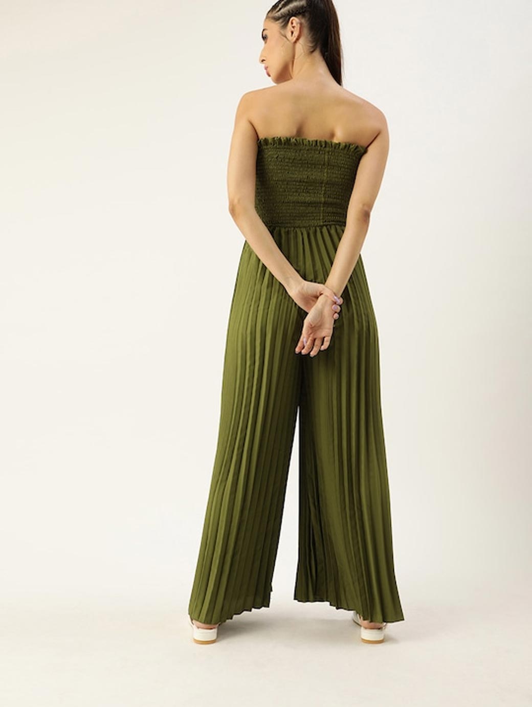 Olive Green solid basic jumpsuit, has a strapless, sleeveless